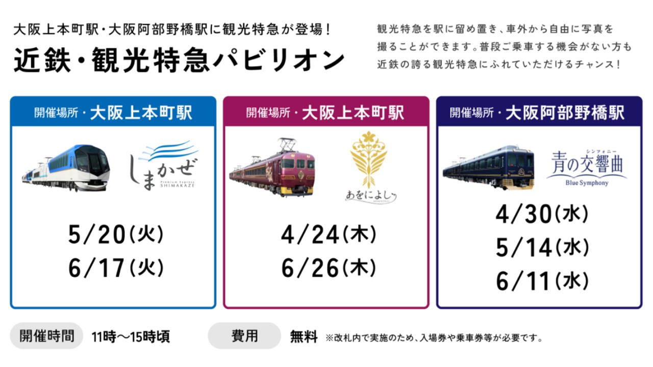 ▼それによると、大阪上本町駅及び大阪阿部野橋駅に、観光特急「しまかぜ」「あをによし」「青の交響曲」を留め置き展示し、車内でカフェ営業を行うとのことです。