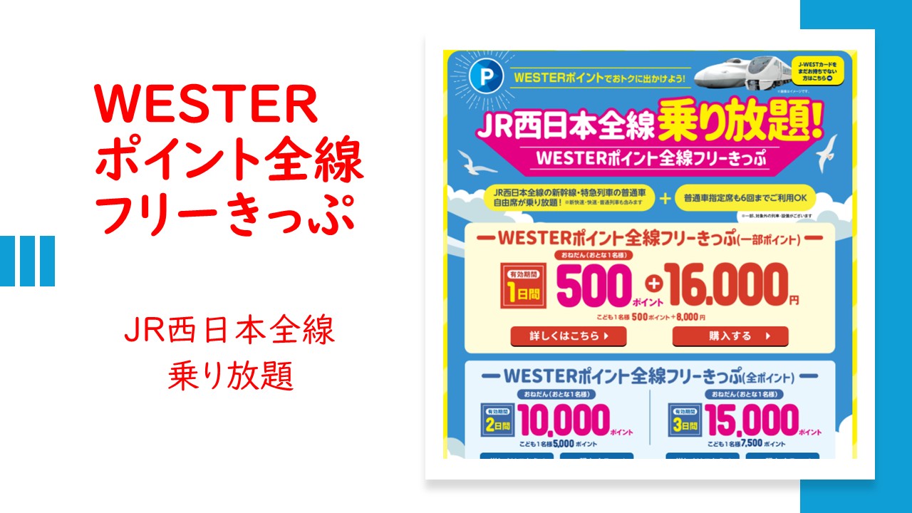 ▼JR西日本は、「WESTERポイント全線フリーきっぷ」のこの夏に発売すると発表しました。