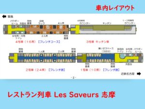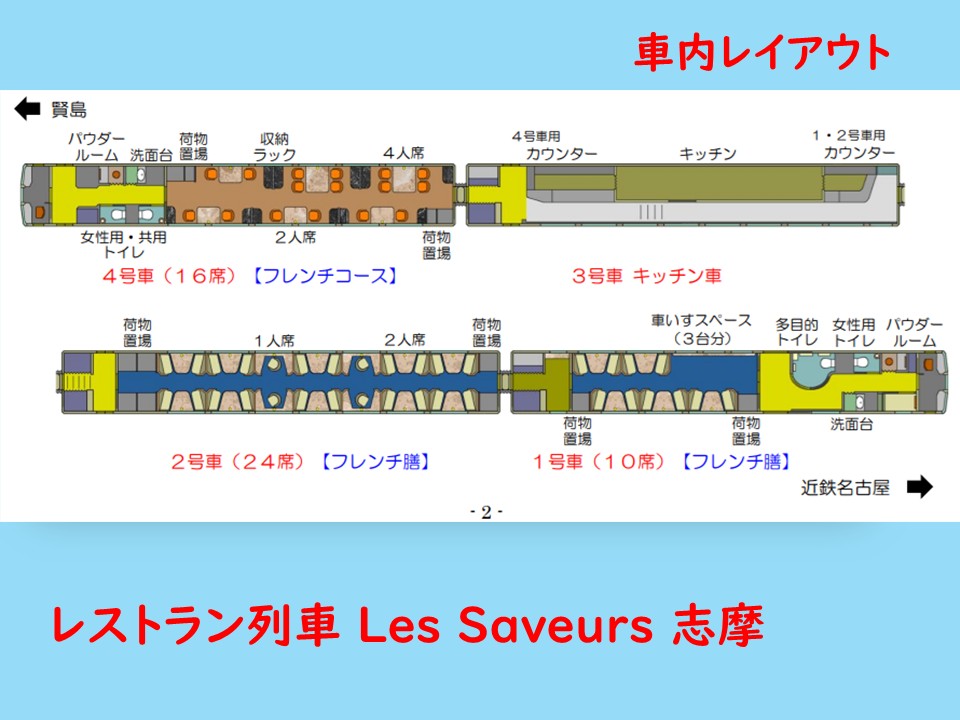 ▼この「Les Saveurs 志摩」は、既存の特急車両12400系4両1編成を、本格的なフレンチを提供する4号車、手軽なフレンチ膳を提供する1・2号車、キッチンを設置する3号車に改造します。