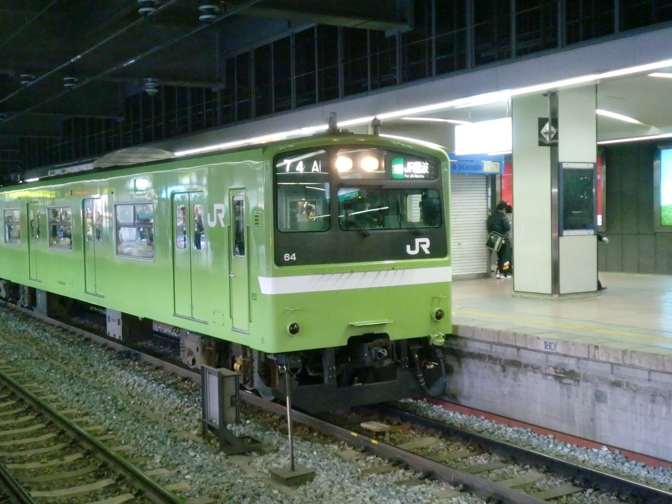 ▼同様に大和路線に転用された201系は、ウグイス色に塗装され、103系と同様に先頭車両の前面には白色の警戒帯が塗られました。