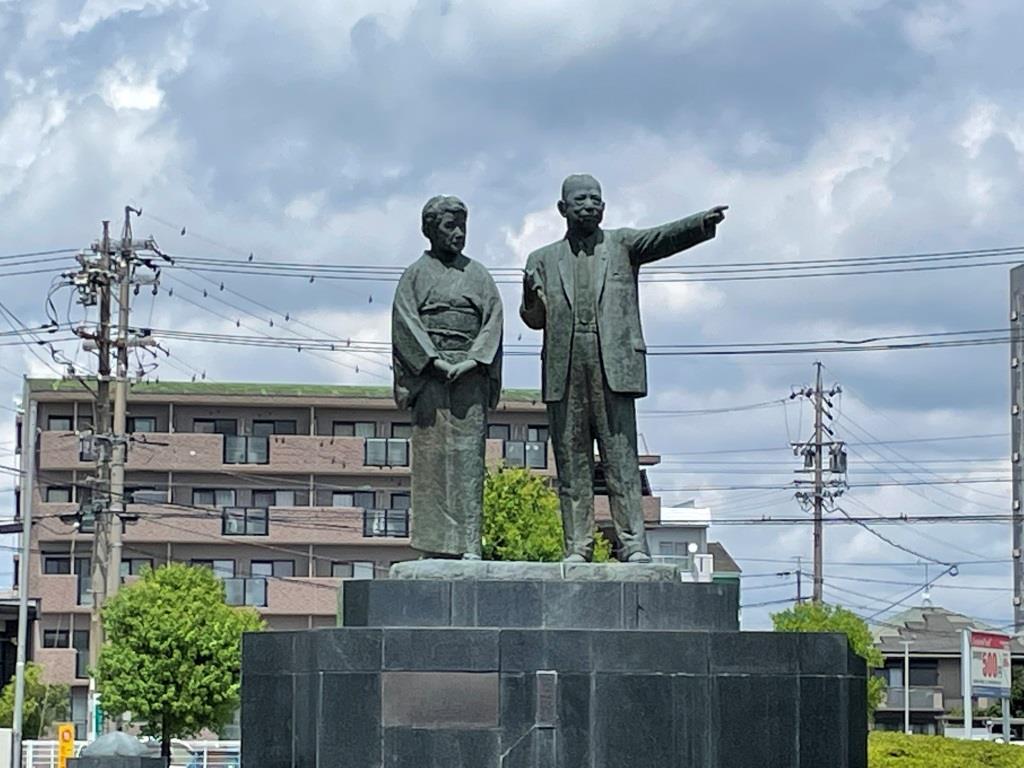 ▼駅前広場には、地元の政治家、大野伴睦夫妻の銅像が建っています。