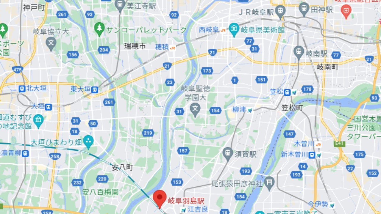▼岐阜羽島駅は、岐阜県羽島市福寿町平方にあります。東西を木曽川と長良川にはさまれています。
