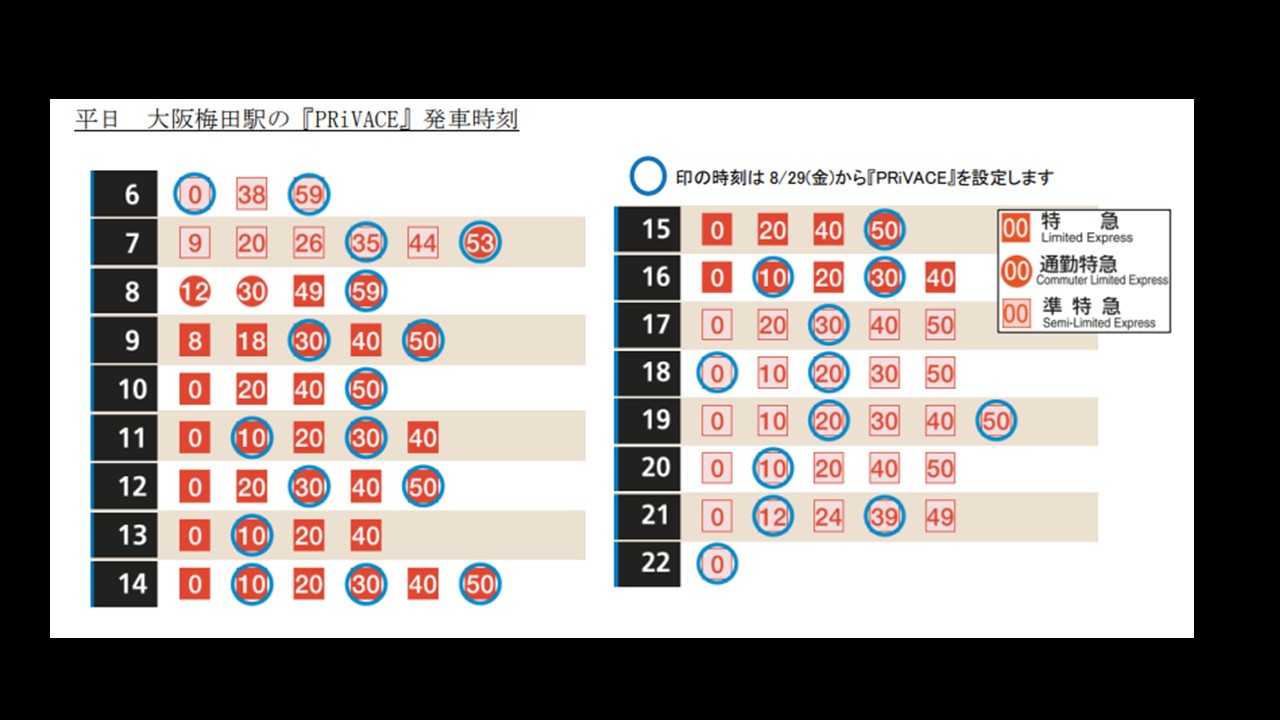 ▼今回の増備で、大阪梅田発の平日の「PRiVACE」の発車本数は22時台が0本から1本に増え、1時間当たり最大6本に増えます。