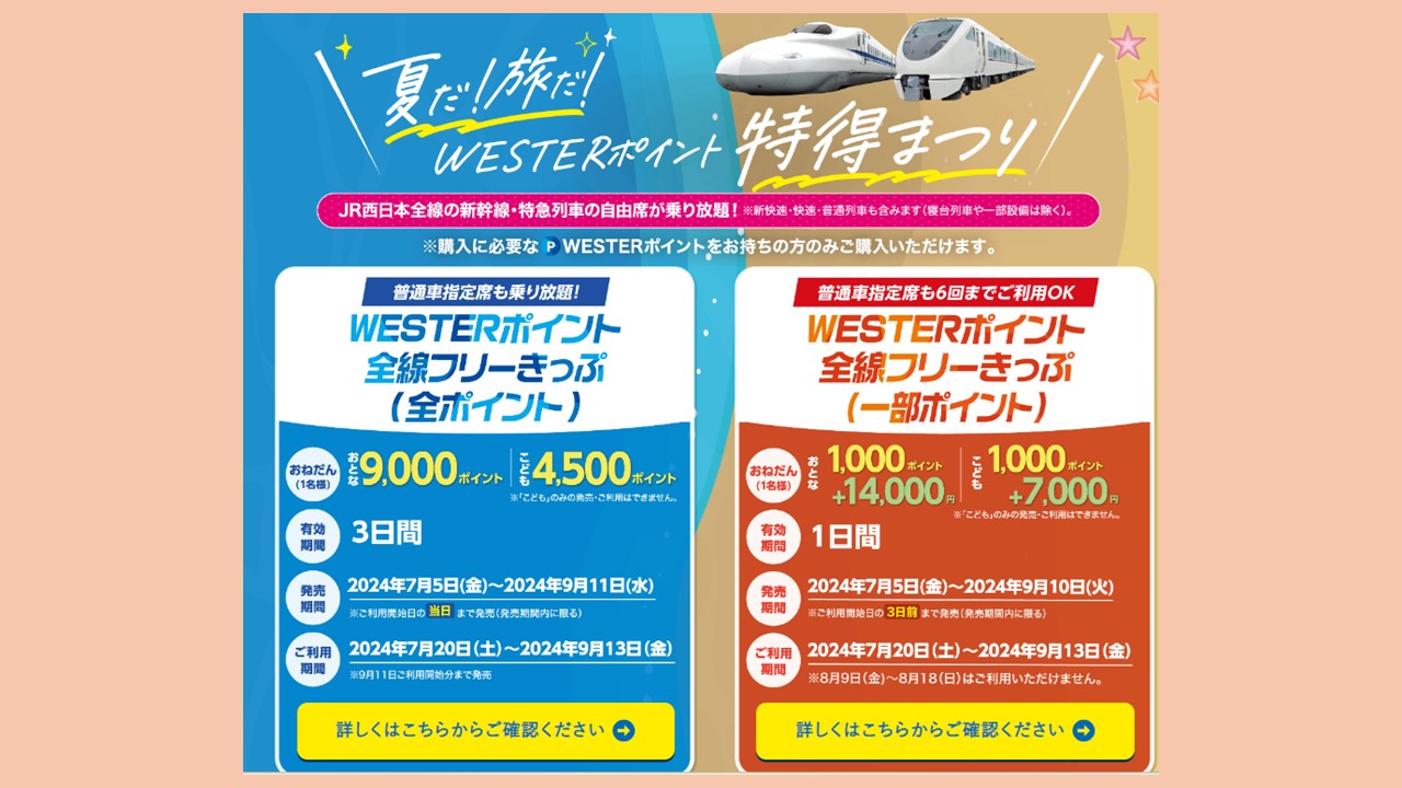 ▼JR西日本は、6月17日のニュースリリースで、WESTERポイント全線フリーきっぷの発売について、発表しました。